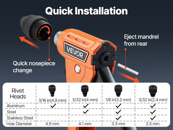 Un kit para más trabajos: Nuestro kit de pistola remachadora incluye 4 boquillas intercambiables de 3/32" (2,4 mm), 1/8" (3,2 mm), 5/32" (4 mm) y 3/16" (4,8 mm), 200 remaches (50 piezas de cada tamaño), 1 boquilla de extracción, 4 brocas (1 pieza de cada tamaño) y un estuche de transporte.