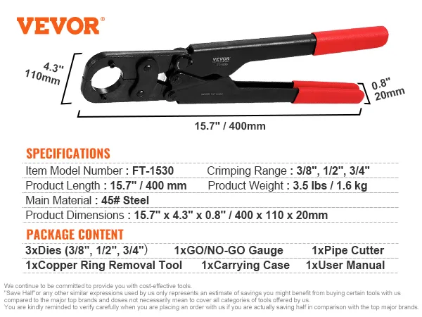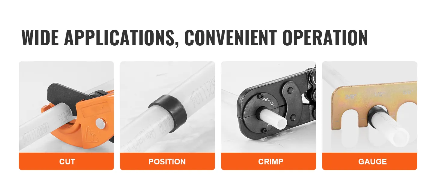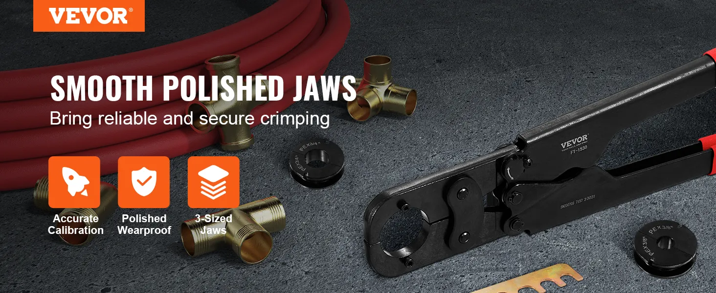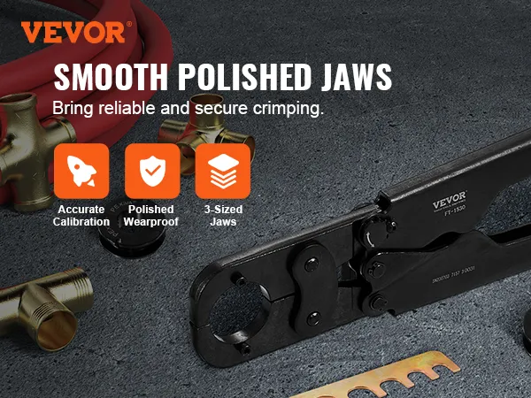 Excelente rendimiento de crimpado: Nuestras herramientas de crimpado son la opción preferida por profesionales y aficionados al bricolaje, ya que cumplen con los altos estándares de las aplicaciones de plomería comercial y residencial, a la vez que ofrecen durabilidad y facilidad de uso. Ya sea que se dedique a la instalación de tuberías o a proyectos de plomería para riego, ¡VEVOR es la mejor opción!