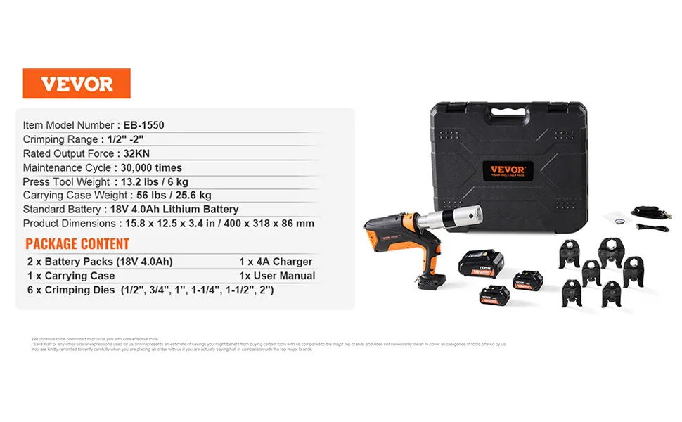 Powerful Brushless Motor: VEVOR 18V automatic crimping pro press tool features a powerful brushless motor, delivering 32KN stable output force without leaks. It boasts a fully enclosed electric hydraulic system, completing fast crimping just within 3-6 second. It can press up to 2-in of copper pipe. (PLEASE NOTE: If you need to crimp other types of tubes, please purchase the corresponding press jaws separately)