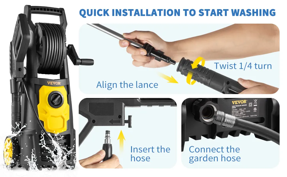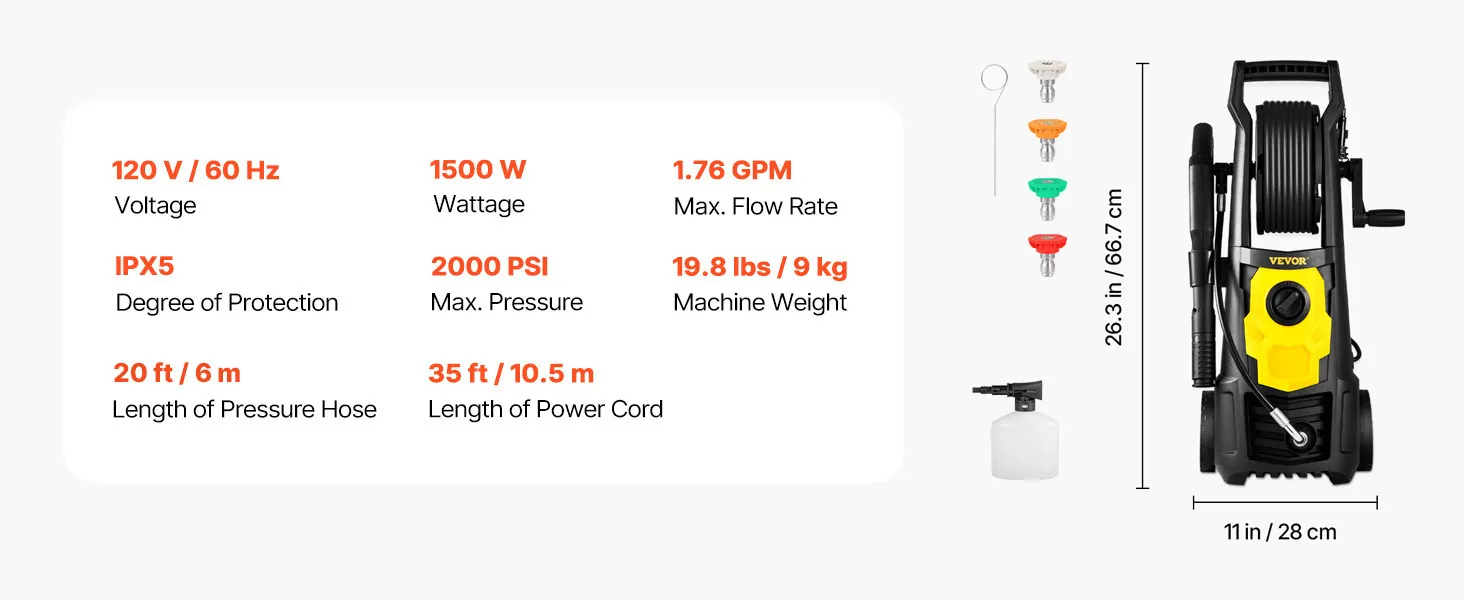La hidrolavadora eléctrica VEVOR cuenta con una manguera de 9 metros (30 pies), lo que permite limpiar áreas extensas sin necesidad de mover la máquina. La manguera se extiende fácilmente a patios, entradas de vehículos, automóviles, terrazas y cercas. Esta manguera larga ayuda a limpiar de forma más rápida y eficiente, consumiendo menos energía y cubriendo una mayor superficie.