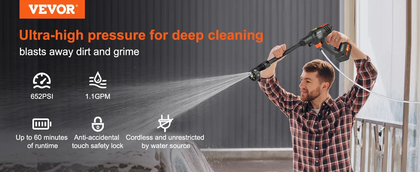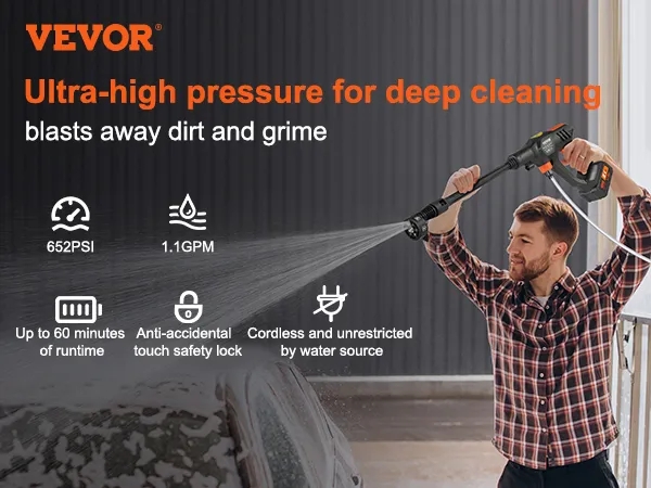 Este potente limpiador a presión puede eliminar fácilmente la suciedad rebelde. El diseño de alto sellado garantiza que no haya fugas de agua. Con su diseño inalámbrico, puedes lavar en cualquier momento sin preocuparte por la fuente de agua. Hasta 60 minutos de tiempo de ejecución eliminan la recarga frecuente.