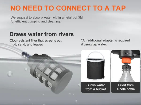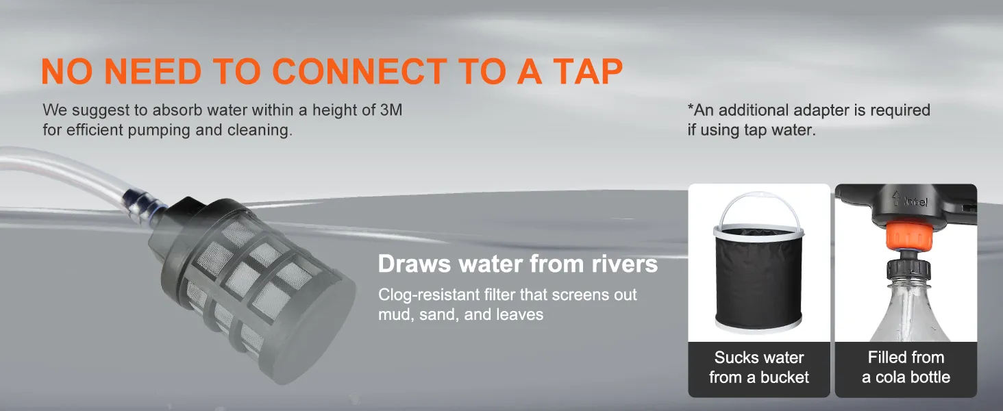 Este limpiador de alta potencia tiene múltiples opciones de suministro de agua, como agua de balde, agua del grifo y botellas de plástico, para que la limpieza sea más flexible. No hay necesidad de conexiones de manguera. Una malla de filtro rápido interna combinada con una boquilla 6 en 1 filtra el barro, la arena y las hojas para evitar obstrucciones.