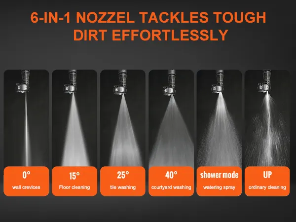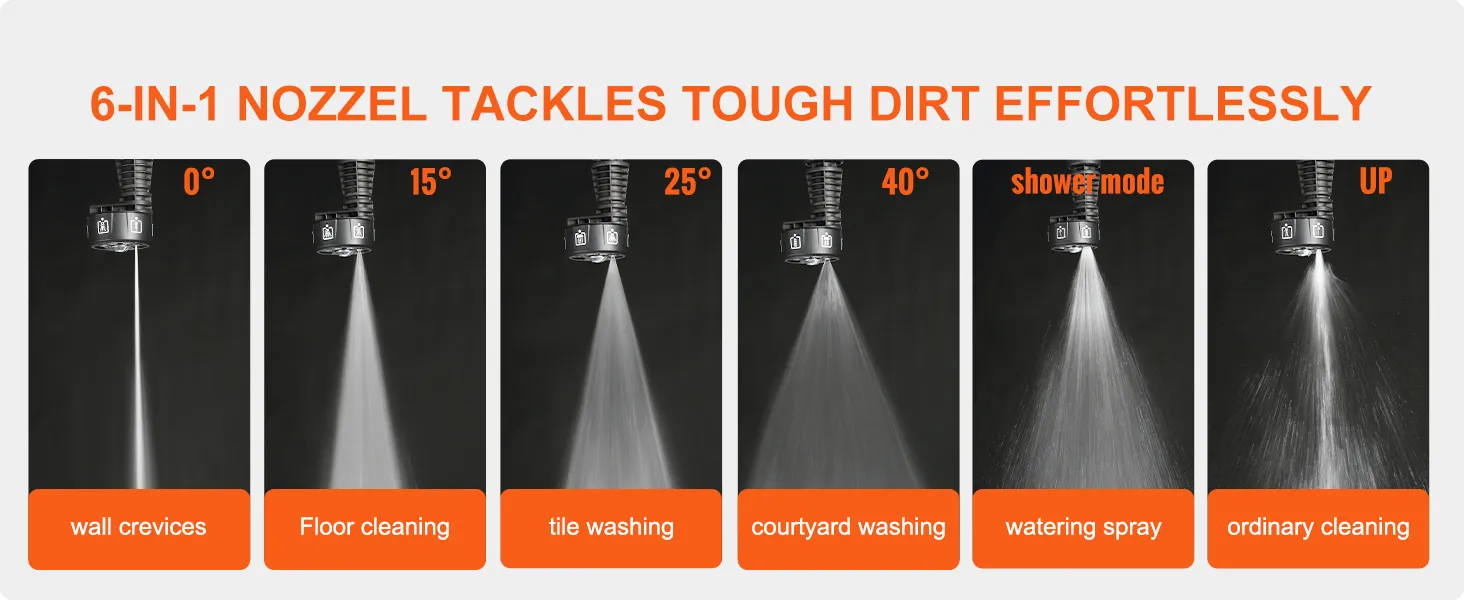 Con ángulos de pulverización de 0°, 15°, 25° y 40°, esta máquina puede manejar fácilmente una variedad de escenarios de limpieza. Los modos "Arriba" y "Ducha" brindan soluciones convenientes para la limpieza del patio. Versátil y equipado con tecnología de boquillas de última generación, ¡hace que la limpieza sea más gratificante!