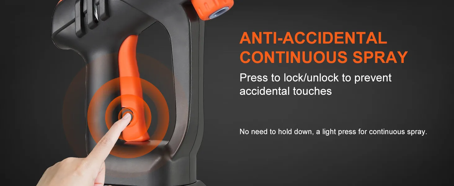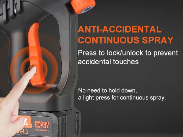 Presione el bloqueo de seguridad para desbloquear antes de usarlo y presiónelo nuevamente para bloquear y evitar una operación accidental. No es necesario mantener presionado el botón de inicio durante mucho tiempo; Una pulsación permite un rociado continuo automático, lo que hace que el lavado sea más sencillo y evita la fatiga de las manos incluso durante el uso prolongado.