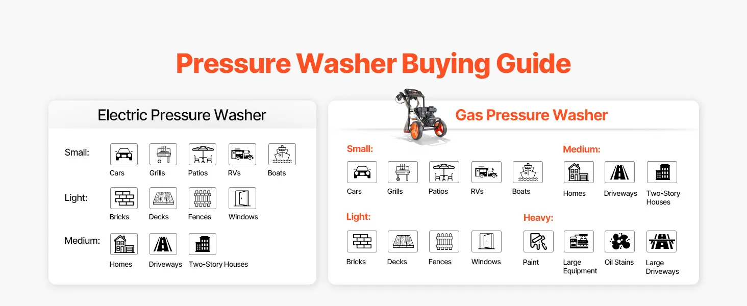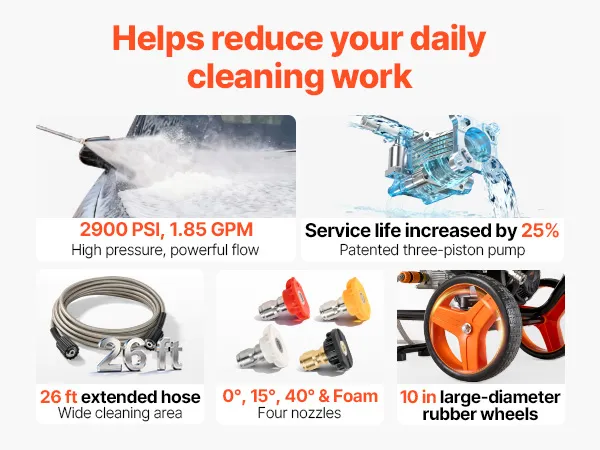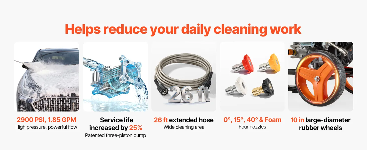 Adecuado para la limpieza diaria: esta máquina hidrolavadora a gas proporciona una presión de 2900 PSI con un flujo de 1,85 GPM para ayudar a limpiar el barro, el musgo y la acumulación pesada en superficies exteriores comunes al tiempo que mejora la eficiencia y ahorra tiempo y esfuerzo.