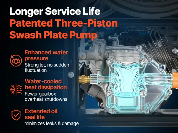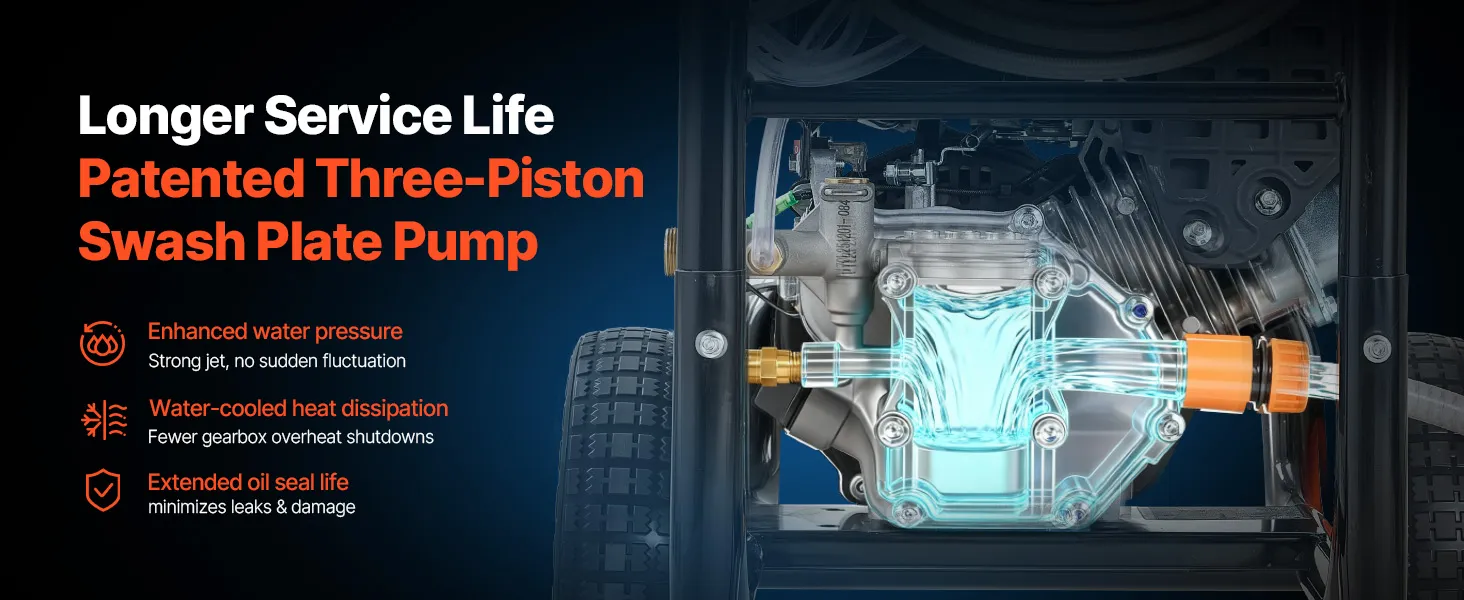 Larga vida útil: esta hidrolavadora a gasolina cuenta con una bomba de placa oscilante de tres pistones patentada que ayuda a controlar el calor de la caja de engranajes, admite una salida de presión estable y reduce las paradas por sobrecalentamiento, el envejecimiento del sello de aceite y las posibles fugas.