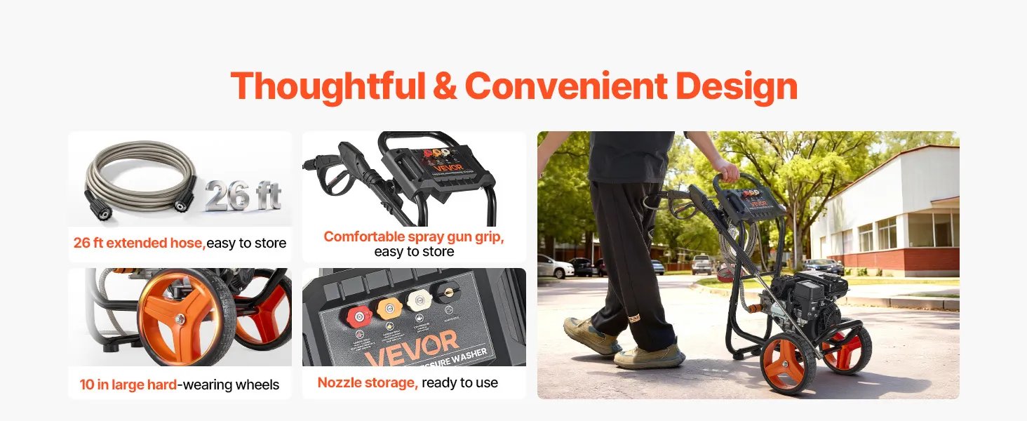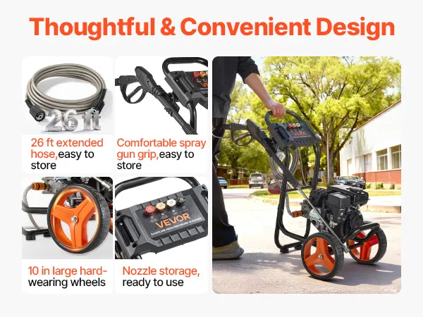 Amplio rango de limpieza: La manguera de alta presión de 26.3 pies le permite moverse libremente una vez conectada a una fuente de agua. Las ruedas de 10 pulgadas de la hidrolavadora a gasolina lo ayudan a cubrir todo el patio trasero o limpiar camionetas de cuatro a seis asientos y vehículos todoterreno grandes.