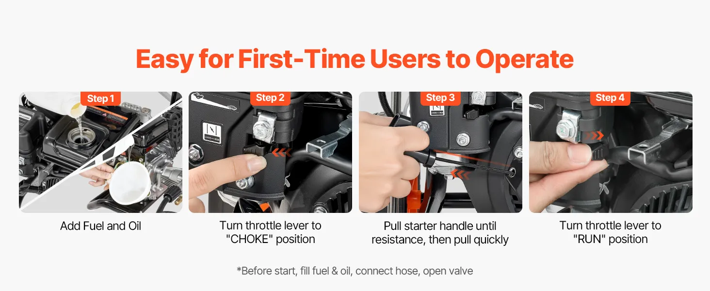 Fácil operación: El manual del usuario suministrado explica cada paso y las precauciones clave. El tanque de combustible de 1,6 L más el tanque de aceite de 0,35 L deben llenarse como se indica antes de conectar el suministro de agua y encender la máquina, lo que hace que estas hidrolavadoras a gas sean fáciles de operar.