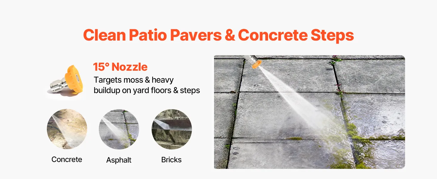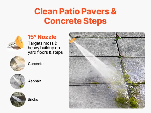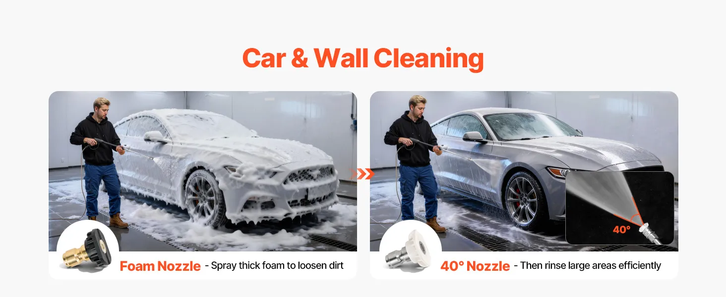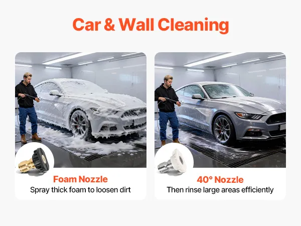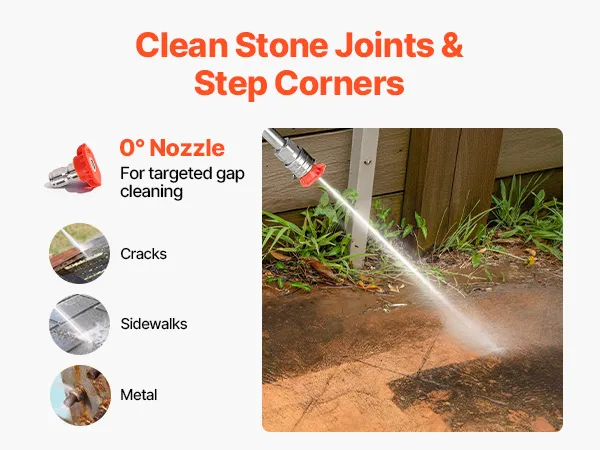Cuatro boquillas de acero inoxidable: Equipada con múltiples boquillas de pulverización que incluyen 0°, 15°, 40° y una de espuma, esta hidrolavadora a gas admite la limpieza específica de huecos, esquinas, azulejos, entradas de vehículos, automóviles y paredes, con puntas de acero inoxidable para uso frecuente.
