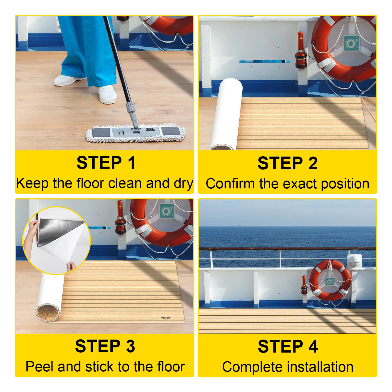 El suelo de la cubierta del mar es fácil de instalar. Simplemente limpie su piso, pele y pegue al piso, presione con fuerza, puede terminarlo usted mismo en unos minutos.