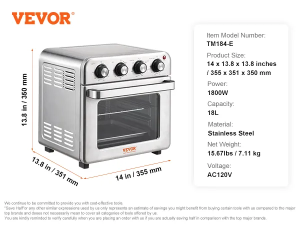 Calefacción eficiente: con 1800 W de potencia y 6 elementos calefactores, este horno tostador freidora se calienta rápida y uniformemente gracias a su ventilador de alta velocidad y su diseño de circulación de aire caliente de 360°. Su comida se cocinará rápida y uniformemente, lo que dará como resultado colores brillantes y atractivos con sabores irresistibles, ¡tal como lo haría un chef!