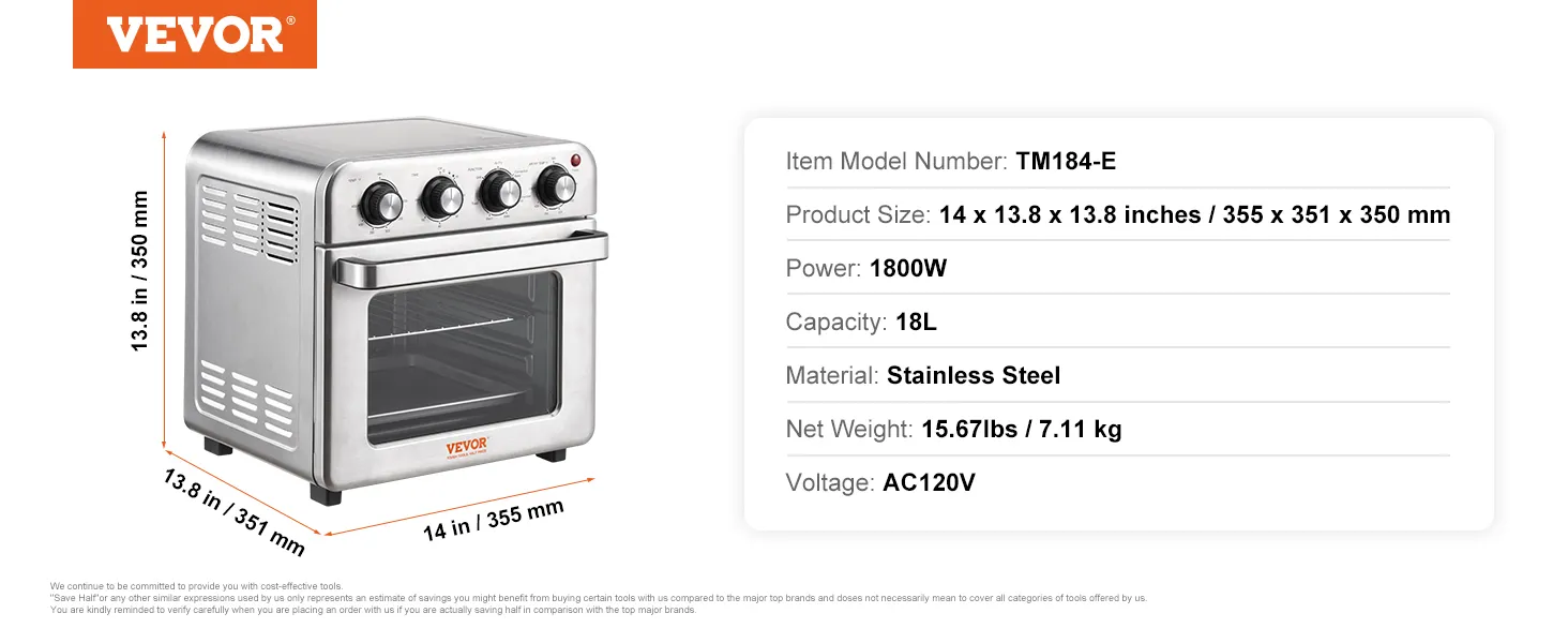 VEVOR Horno tostador freidora de aire 7 en 1, horno de convección de 18 L, horno tostador de acero inoxidable de 1700 W, combo de encimera con parrilla, bandeja para pizza, guantes, 6 rebanadas de pan tostado, pizza de 10 pulgadas, uso doméstico y comercial