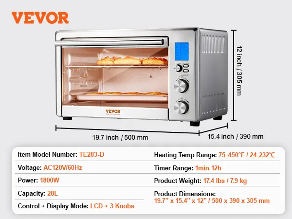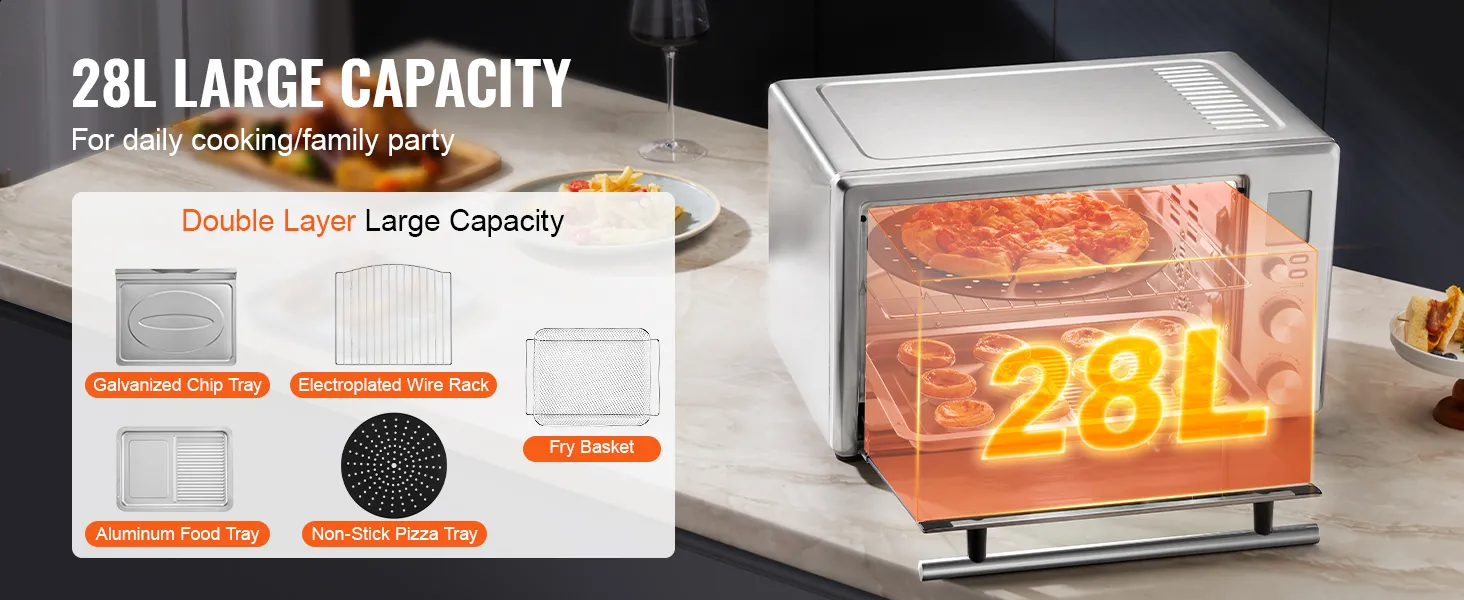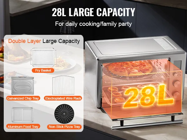 Gran capacidad de 28 L/29.6 qt: Su diseño de 28 L/29.6 qt tiene capacidad para 6 rebanadas de pan tostado, 8 alitas de pollo, una pizza de 30 cm o un pollo de 1.1 kg. ¡Es un excelente ayudante para cocinar a diario y para las reuniones familiares!