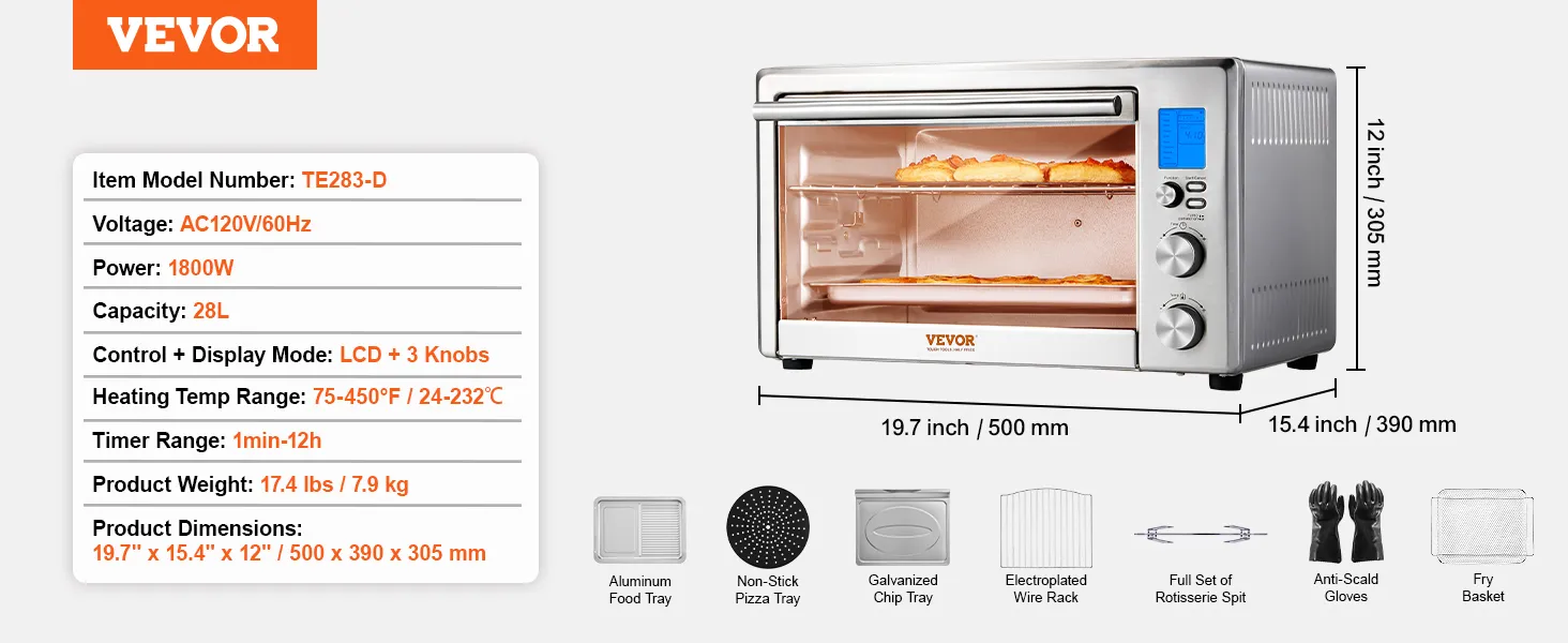 Horno tostador con freidora de aire VEVOR 13 en 1, horno de convección de 28 L/29,6 Qt, horno tostador de 2 niveles de 1800 W, combo de encimera con rejillas de alambre, bandeja para pizza, guantes, para uso doméstico y comercial.
