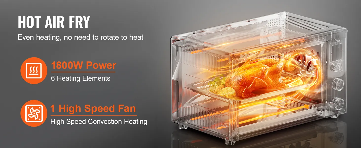 Calentamiento eficiente: Con 1800 W de potencia, 4 elementos calefactores y un ventilador de alta velocidad, este horno ofrece una circulación de aire caliente de 360° para un calentamiento uniforme y rápido. Garantiza resultados vibrantes y deliciosos, permitiéndole disfrutar de la calidad de un chef estrella en casa.