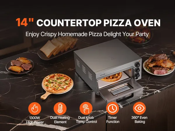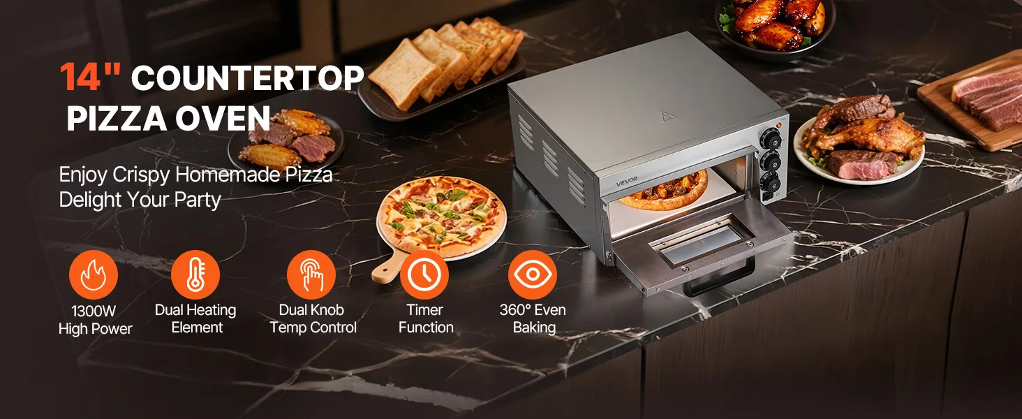 El horno de pizza eléctrico VEVOR de 14 pulgadas cuenta con una construcción de acero inoxidable de grado alimenticio, control de temperatura preciso de 122-662 ℉/50-350 ℃. ¡La alta potencia y los tubos de calentamiento duales brindan una distribución uniforme y eficiente del calor para obtener resultados de horneado perfectos en todo momento!