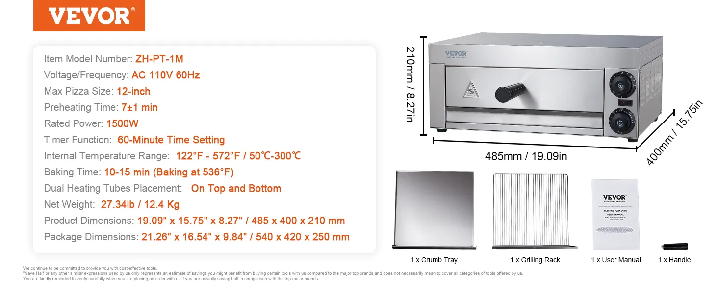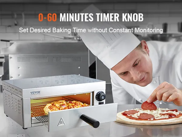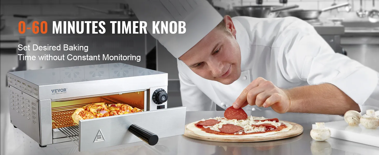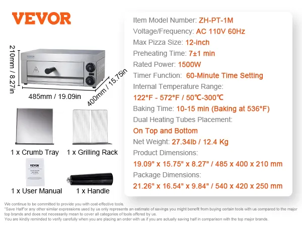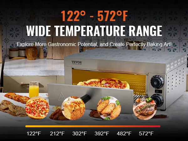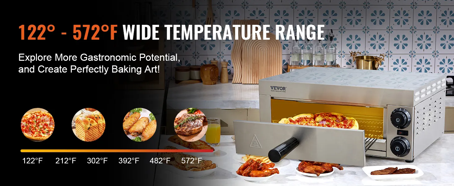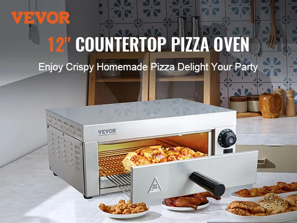 El horno eléctrico para pizza VEVOR de 12 pulgadas cuenta con una construcción de acero inoxidable apto para uso alimentario, un amplio rango de temperatura de 122 °F a 572 °F y un control de tiempo preciso de 0 a 60 minutos. ¡Los tubos de calentamiento duales y de alta potencia de 1500 vatios brindan una distribución uniforme y eficiente del calor para obtener resultados de horneado perfectos en todo momento!