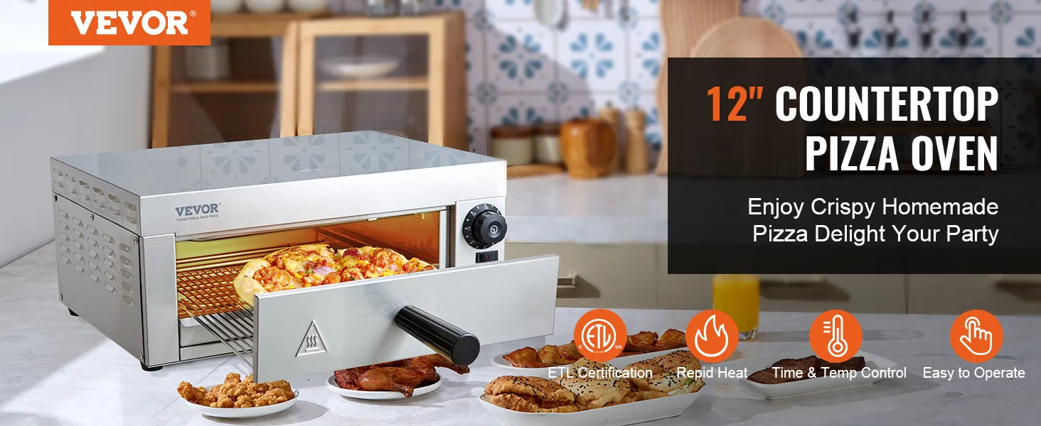 Horno eléctrico para pizza de alta calidad: fabricado con acero inoxidable apto para uso alimentario con certificación ETL, el horno eléctrico para pizza VEVOR le garantiza una experiencia de horneado segura y sin complicaciones. Junto con la parrilla para hornear y la bandeja recogemigas proporcionadas, este horno para pizzas de encimera puede hornear pizzas crujientes de hasta 12 pulgadas, perfecto para su cocina, dormitorio, campamento y fiestas.