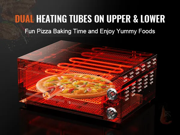 Disfrute de pizzas crujientes en todo momento: el potente horno para pizzas comercial de 1500 W le permite hornear pizzas crujientes y deliciosas en solo unos minutos. Junto con los tubos de calentamiento dobles superior e inferior, libera un horneado uniforme de 360° y suficiente calor para cocinar rápidamente sus alimentos a la perfección en todo momento.