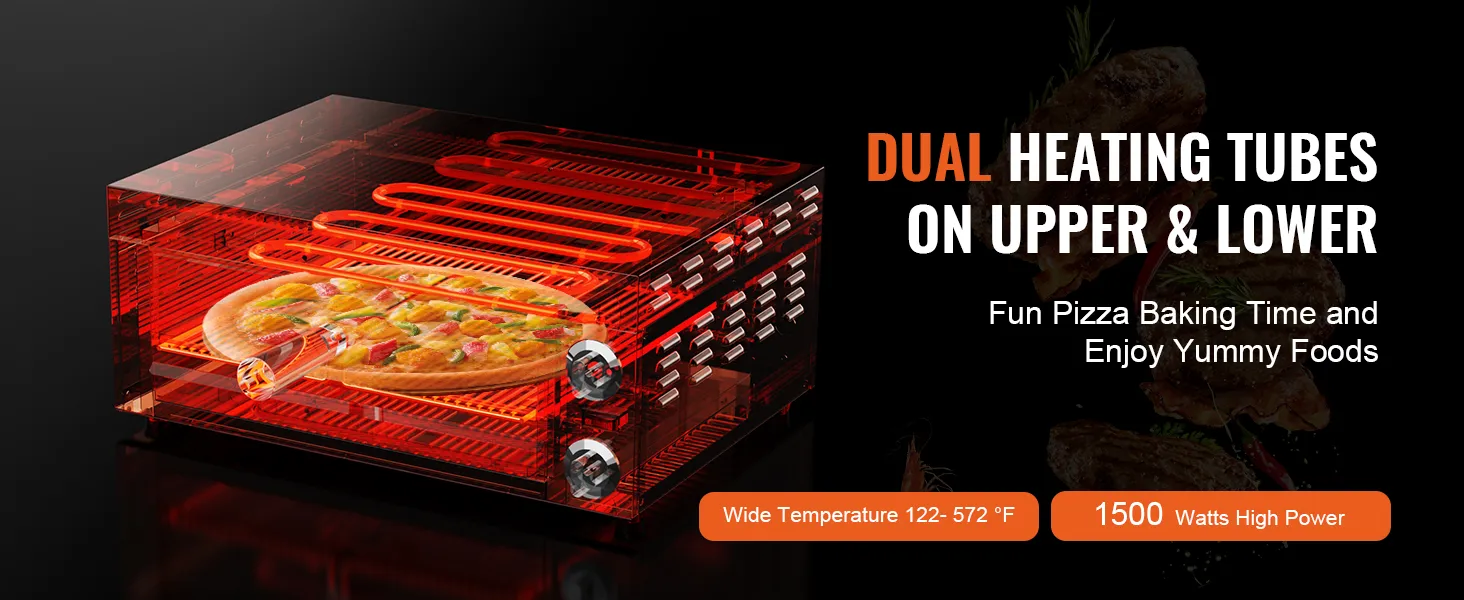 En tan solo unos minutos, el horno para pizzas de alta potencia de 1500 W le permite crear pizzas deliciosas y crujientes. Con sus tubos de calentamiento dobles superior e inferior, ofrece un horneado uniforme de 360° y un calor rápido para una cocción rápida, lo que da como resultado alimentos perfectamente cocinados en todo momento.