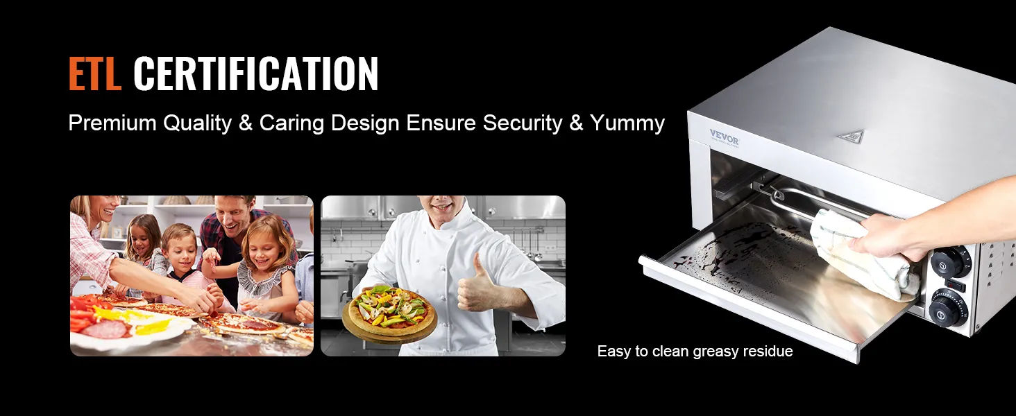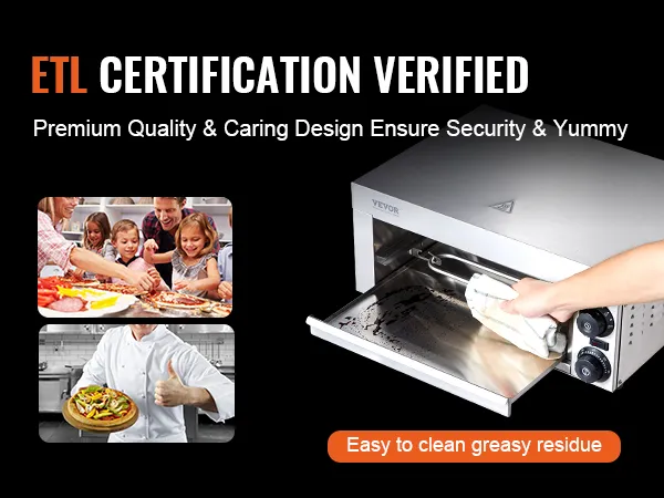Fabricado con acero inoxidable apto para uso alimentario con certificación ETL, el horno para pizza comercial VEVOR garantiza no solo durabilidad sino también un entorno de horneado seguro y saludable. Además, el material interior antiadherente permite una limpieza sin esfuerzo y una cocción divertida.