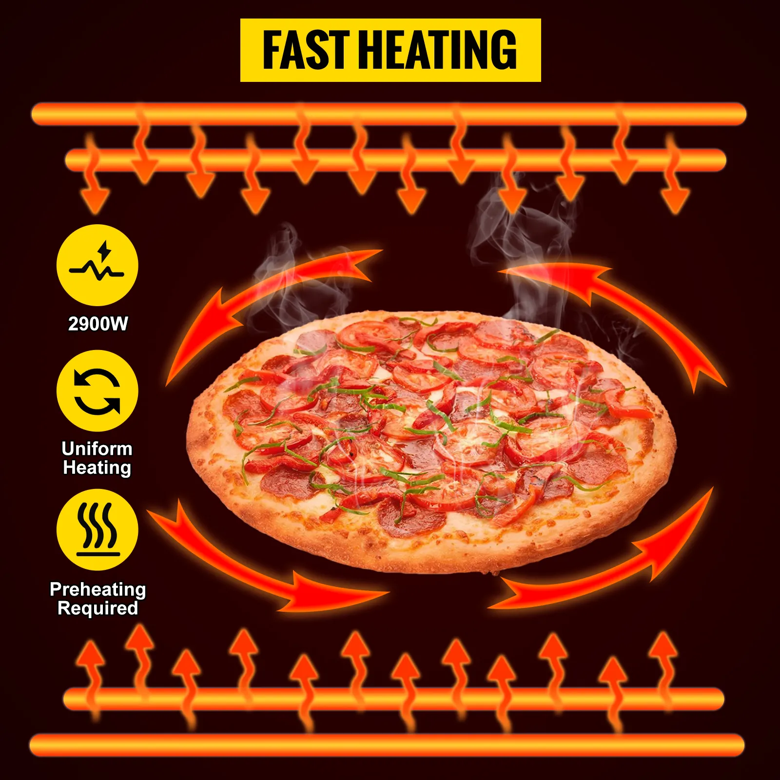 La alta potencia de 2900 W y los cuatro tubos de calentamiento de cuarzo distribuidos hacia arriba y hacia abajo crean el entorno de calentamiento más efectivo para su pizza, brindando un sabor delicioso y crujiente.