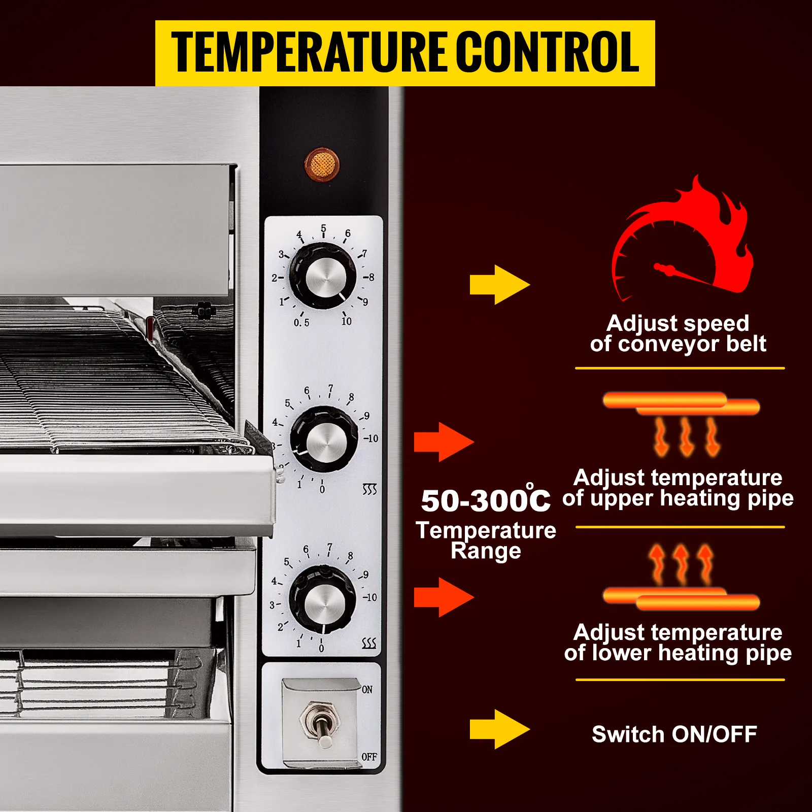 Ajuste sin complicaciones: hay tres perillas y un interruptor en la parte inferior del panel. La primera perilla controla la velocidad de la cinta transportadora, y las perillas segunda y tercera controlan la temperatura de los tubos de calentamiento superior e inferior, respectivamente. Rango de temperatura ajustable: 50-300 ℃. Hornee alimentos para que coincida con su atención a la calidad y deje a los clientes asombrados.