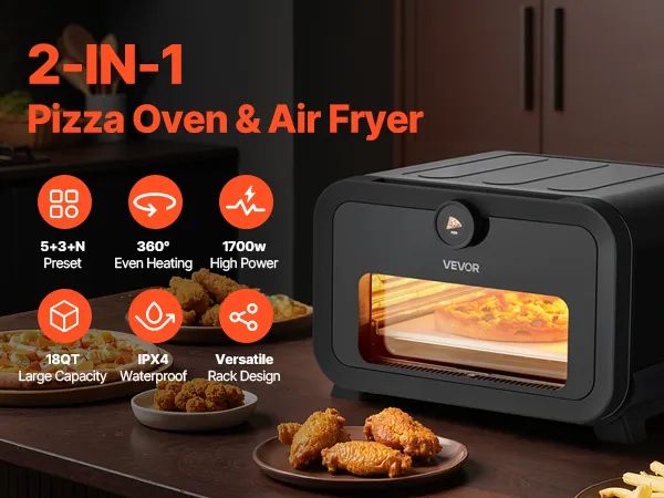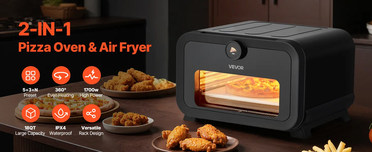 VEVOR Electric Pizza Oven & Air Fryer Combo – Features 5 pizza modes, 3 air-fry presets, and a DIY mode for flexible baking. Perfect for home dinners, parties, and prepping takeout favorites.