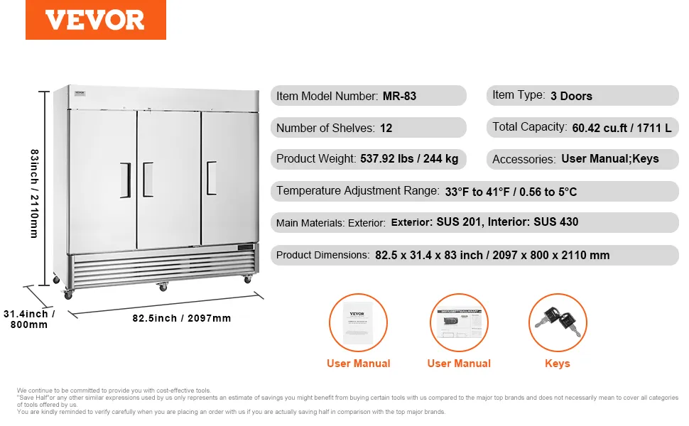 Experimente una frescura duradera con el refrigerador comercial VEVOR de 60.42 pies cúbicos y 3 puertas. Combina un enfriamiento eficiente con una pantalla digital de temperatura, lo que permite ajustes precisos. La descongelación automática enfría rápidamente y ahorra energía, asegurando que sus alimentos se mantengan frescos por más tiempo.