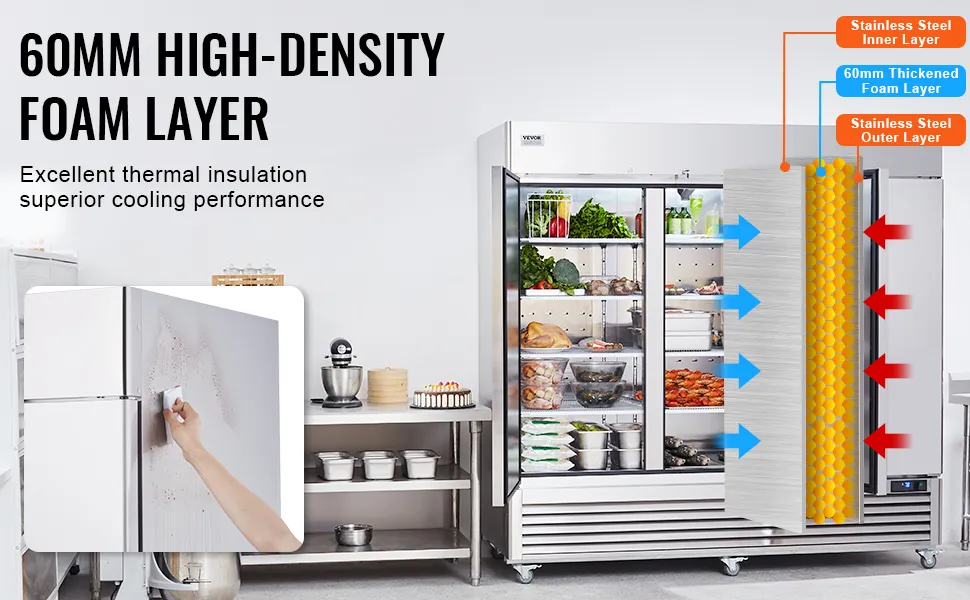 Con una capa de espuma de alta densidad de 60 mm, nuestro refrigerador vertical de 3 puertas garantiza un aislamiento excepcional y mantiene una temperatura interna estable. Fabricado con acero inoxidable en el interior y el exterior, ofrece gran durabilidad y conserva eficazmente el frío para conservar la frescura de los alimentos.