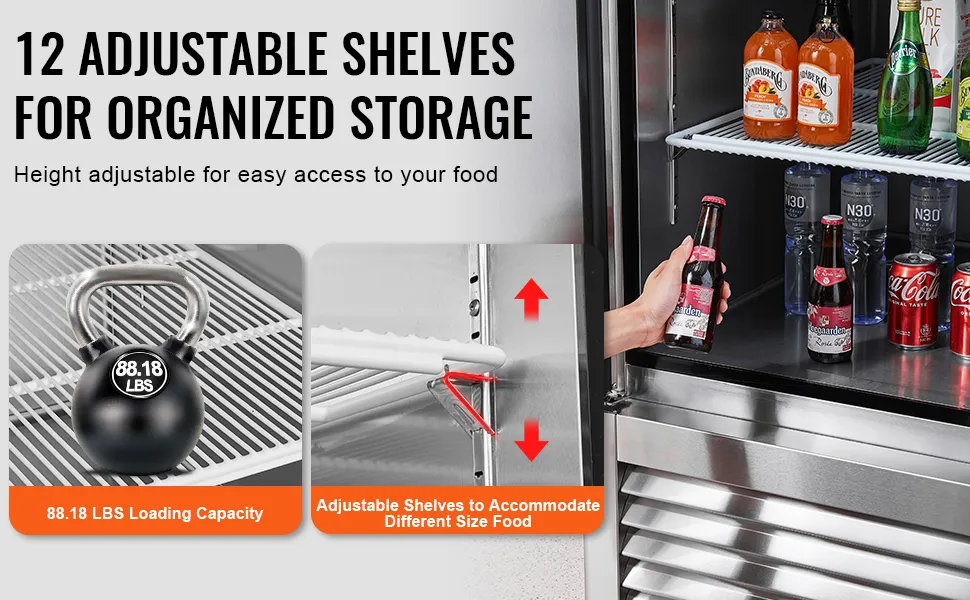 Construcción duradera y robusta: Fabricado en acero inoxidable resistente a la corrosión, nuestro refrigerador comercial de 3 puertas es resistente y elegante, lo que facilita su limpieza y mantenimiento. Con 12 estantes ajustables, cada uno con capacidad para 40 kg, organizar los ingredientes es facilísimo, ofreciendo amplio espacio y un almacenamiento ordenado.