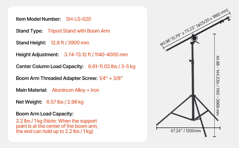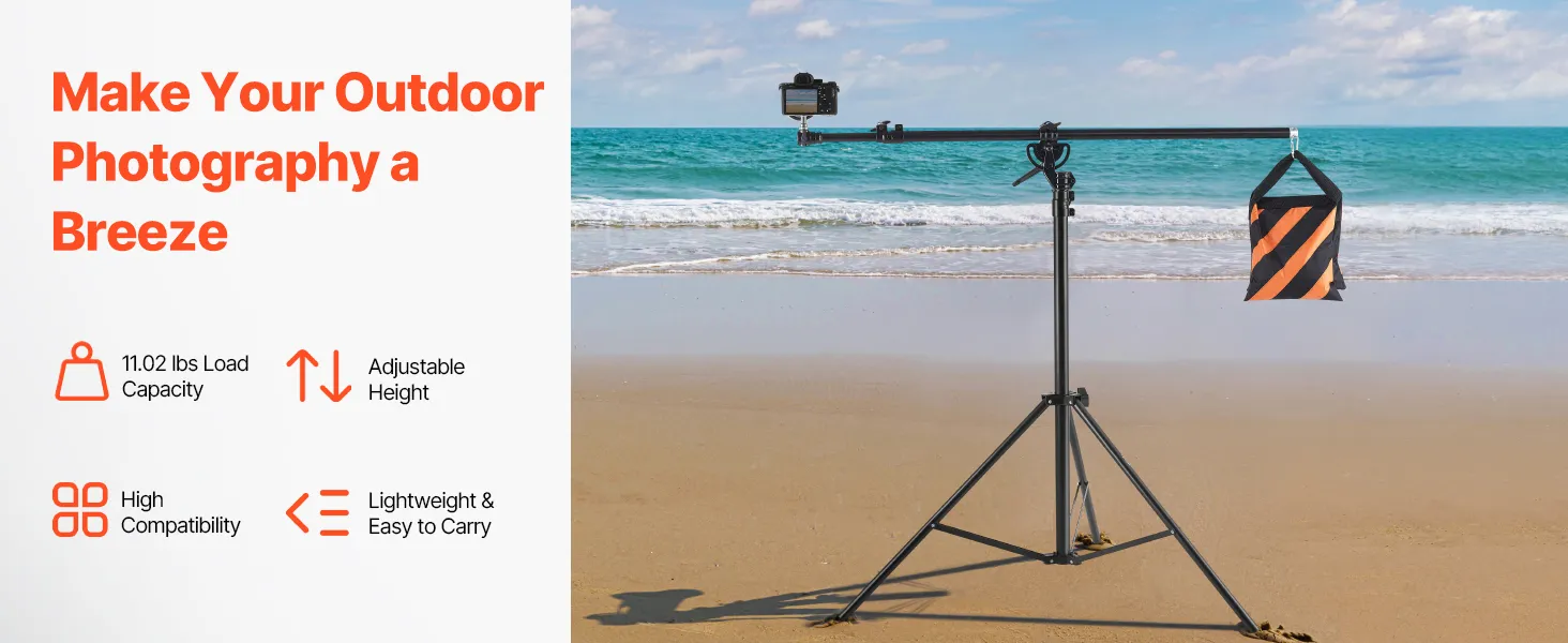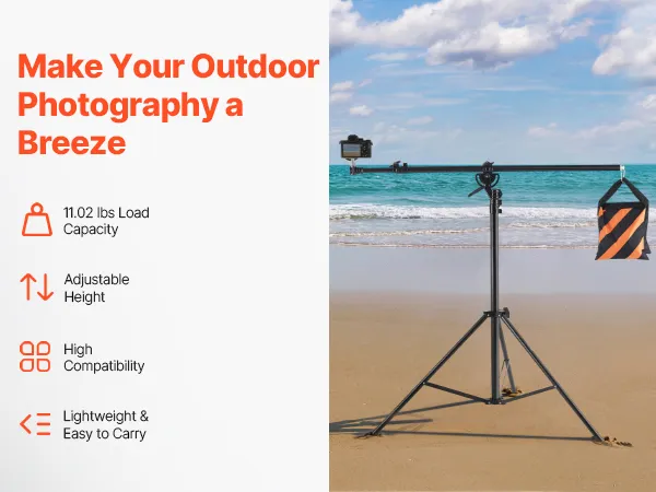Capacidad máxima de carga de 11,02 libras: Fabricado en aleación de aluminio duradera, este soporte de luz con brazo articulado es liviano y fácil de transportar. La columna central soporta de 6,61 a 11,02 libras (3 a 5 kg), mientras que el brazo articulado puede soportar hasta 2,2 libras (1 kg). Se incluye una bolsa de arena para minimizar el tambaleo durante el uso al aire libre en diferentes terrenos.