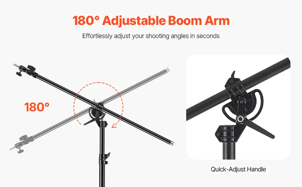 El brazo articulado ajustable a 180° permite cambios de ángulo rápidos y sencillos, lo que le permite capturar múltiples perspectivas o ajustar la iluminación sin esfuerzo. Nuestro soporte de iluminación de aluminio con amortiguación de aire mejora significativamente su flujo de trabajo, ahorrando tiempo y aumentando la productividad durante sus tomas.