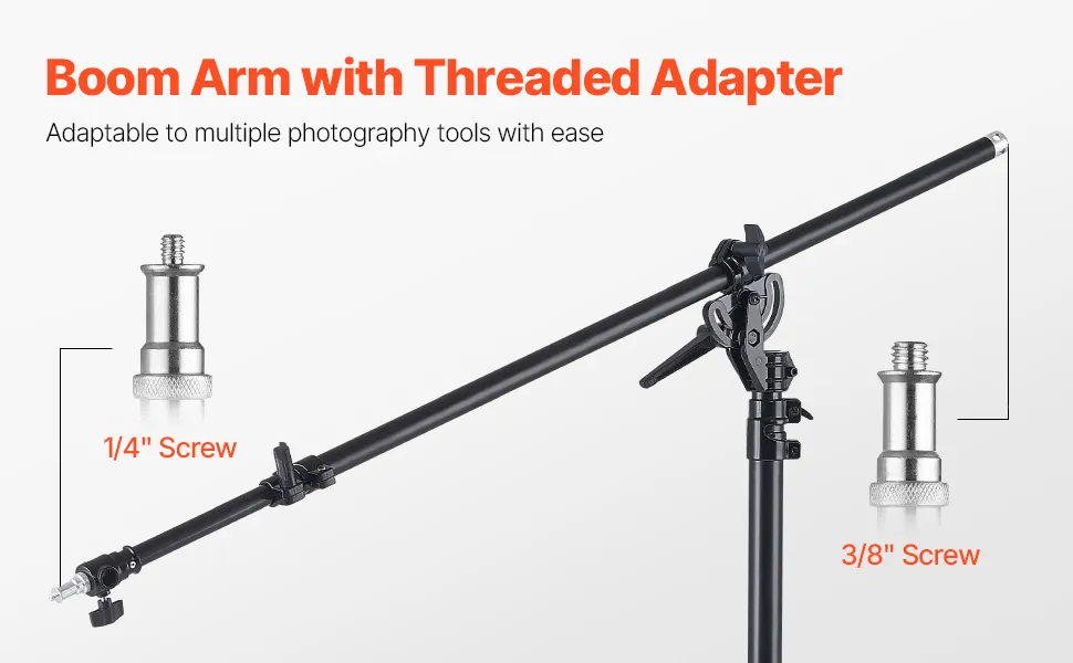 Compatible con varios equipos de fotografía: la columna central cuenta con un adaptador de rosca universal y el brazo articulado incluye un adaptador de rosca de 1/4 in y 3/8 in. Esto garantiza la compatibilidad con la mayoría de los dispositivos de fotografía, como reflectores de video de estudio, softboxes, equipos suspendidos y luces individuales.