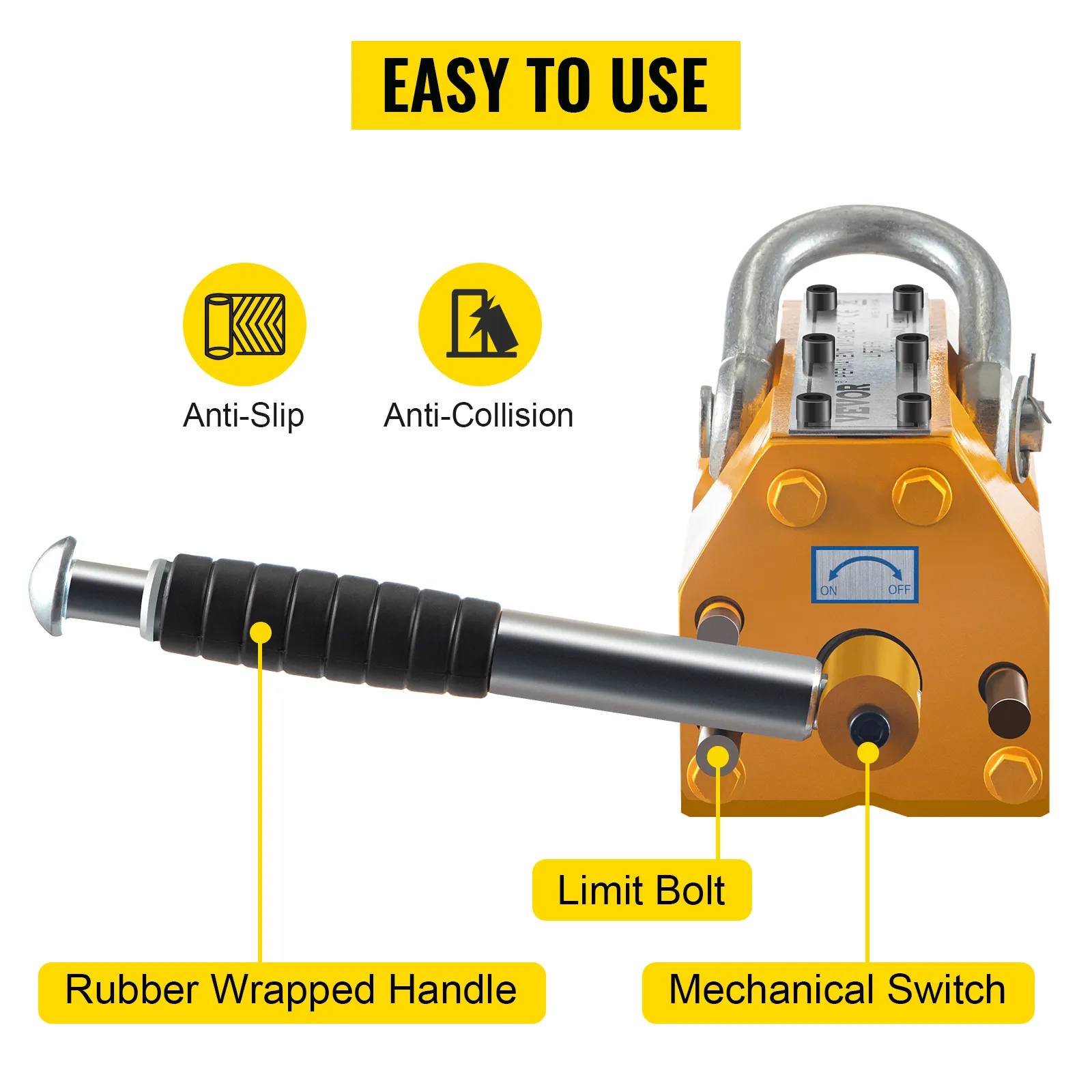 El diseño único del mango envuelto por el caucho y es para la seguridad de los clientes cuando se utiliza el imán de elevación. Es antideslizante y anticolisión. El perno de límite puede fijar firmemente el mango. El interruptor mecánico de palanca es conveniente y ahorra trabajo.