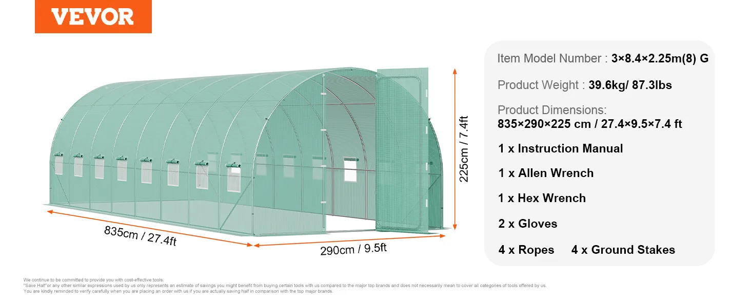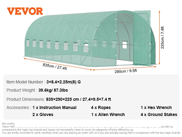 Amplio diseño de entrada: con un generoso espacio de 8,3 x 2,9 x 2,3 m, este invernadero tipo túnel es ideal para una variedad de necesidades de plantas. Permite un fácil acceso para la gestión y el mantenimiento, y ofrece espacio para múltiples estantes para plantas, lo que lo hace adecuado tanto para la jardinería doméstica como comercial.