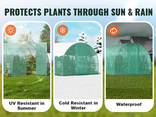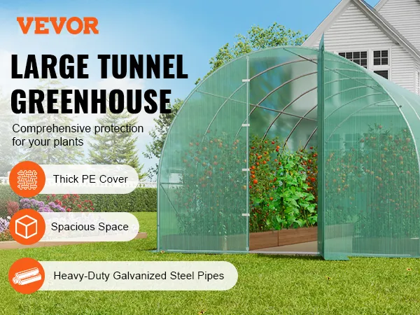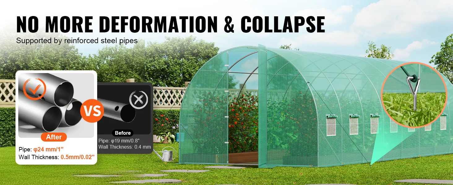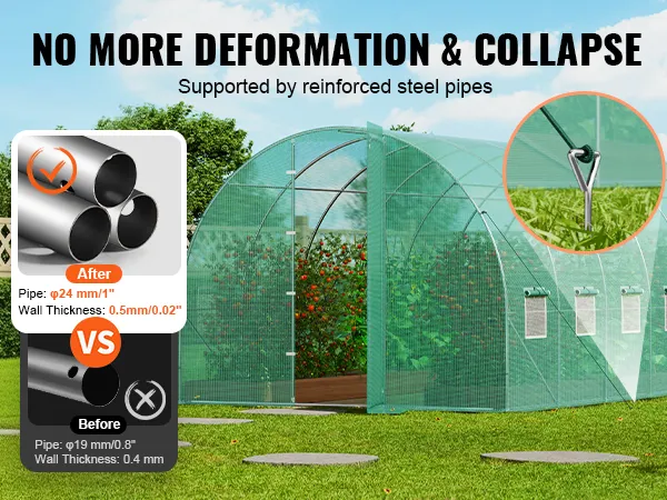 Los tubos de acero mejorados de 24 mm/0,94" de espesor con un espesor de pared de 0,5 mm/0,02", combinados con estacas en forma de U y ganchos de plástico, garantizan una estructura de invernadero más estable. El invernadero de túnel alto resiste fácilmente las duras condiciones climáticas, lo que elimina las preocupaciones por la deformación y el colapso.