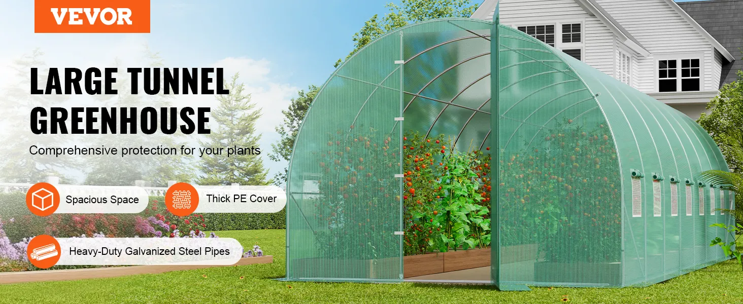 Invernadero túnel VEVOR de 8,4 x 2,9 x 2,3 m, con estructura de acero galvanizado, cubierta de polietileno verde, puerta batiente y 16 ventanas enrollables para exteriores.
