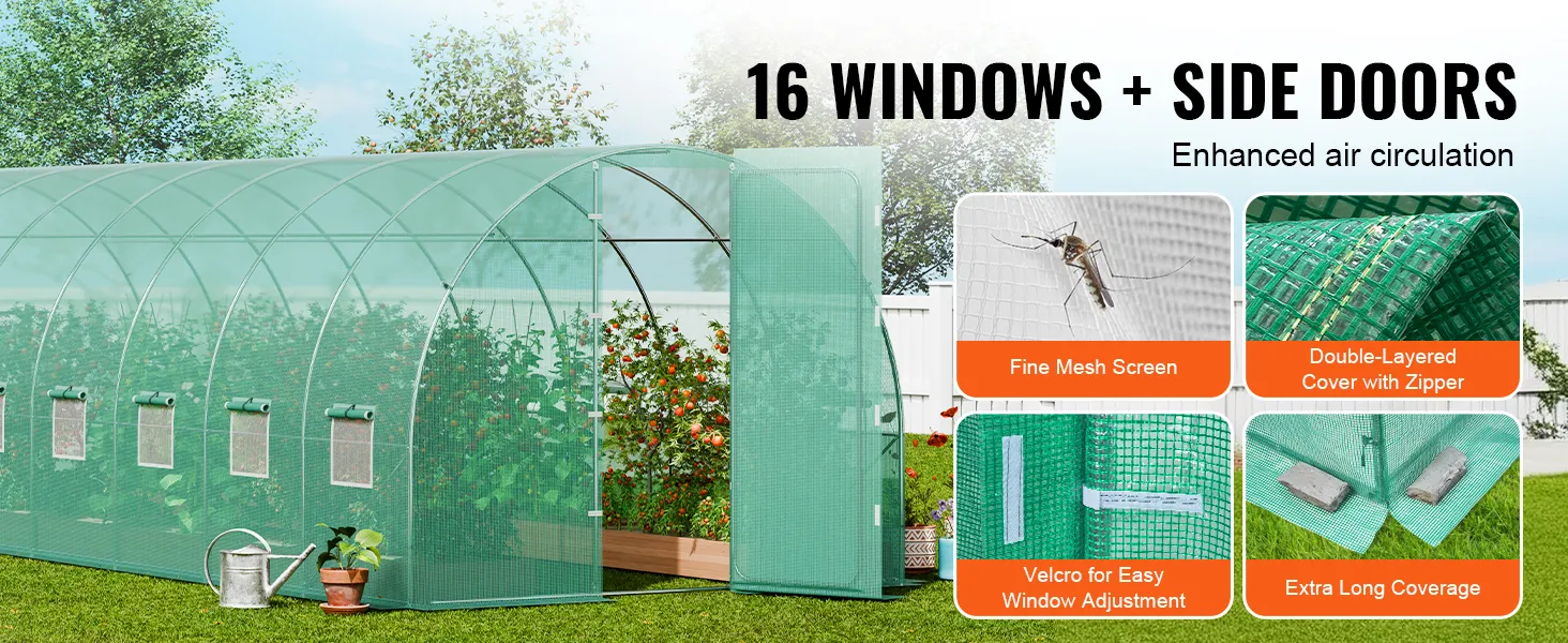 Nuestro invernadero de túnel cuenta con 16 ventanas y una puerta para mejorar la circulación del aire. Equipado con mallas para mantener alejadas a las pequeñas criaturas y reducir las enfermedades, las cerraduras de las puertas evitan que se abran accidentalmente. El velcro en las ventanas permite ajustes sencillos, lo que garantiza la ventilación y protege la salud de las plantas.