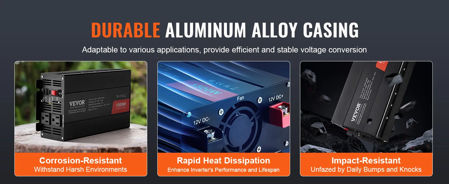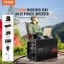 Inversor de onda sinusoidal modificada VEVOR, 1500 W, CC 12 V a CA 120 V, con 2 salidas de CA, 2 puertos USB, 1 puerto tipo C y 6 fusibles de repuesto, para dispositivos domésticos pequeños como smartphones y portátiles. Certificación CE y FCC.