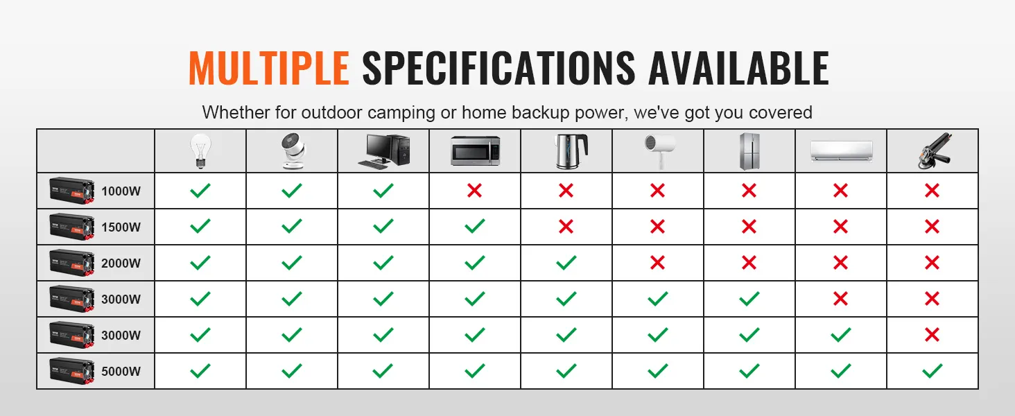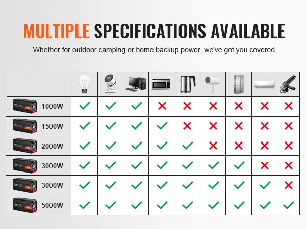 Inversor de potencia de onda sinusoidal modificada: transforma CC de 12 V en energía estable de CA de 120 V sin esfuerzo. Con una potencia continua de 1500 W, una potencia máxima de 3000 W y una eficiencia de carga completa de hasta el 88 %, nuestro inversor de energía es su opción para dispositivos domésticos pequeños como teléfonos inteligentes, cadenas de luces recargables, computadoras portátiles, consolas de juegos, Kindles, iPads, etc. (El total La potencia de los dispositivos conectados no debe exceder la potencia nominal del inversor. Para necesidades de mayor potencia, considere nuestros modelos de alta carga).