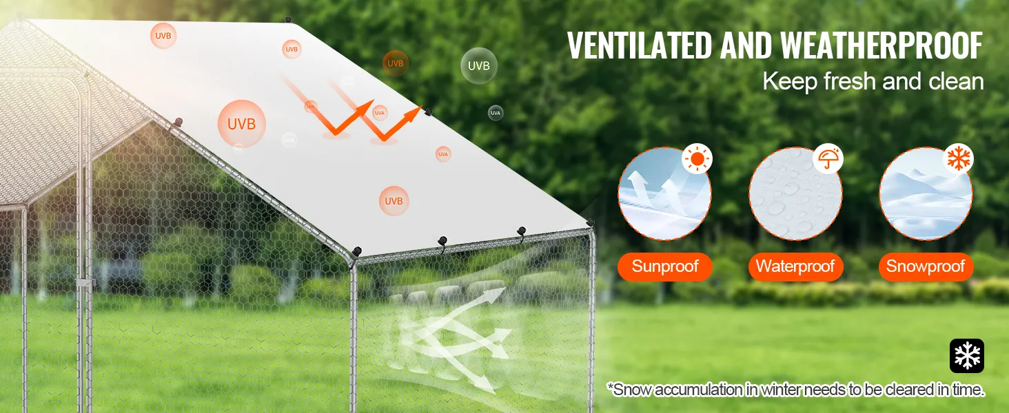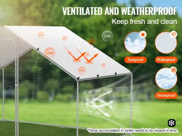 El gallinero grande VEVOR está diseñado con ventilación en los cuatro lados para reducir el crecimiento bacteriano y los olores. Recuerde limpiar la acumulación de nieve en invierno para que sus aves de corral tengan un espacio fresco y saludable.