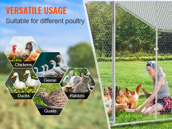 Aplicación versátil: el gallinero para patio con cubierta no solo es adecuado para gallinas sino también para patos, codornices, conejos, gansos y otras aves de corral. Satisface sus necesidades, proporcionando un espacio de vida seguro y cómodo para las aves de corral.