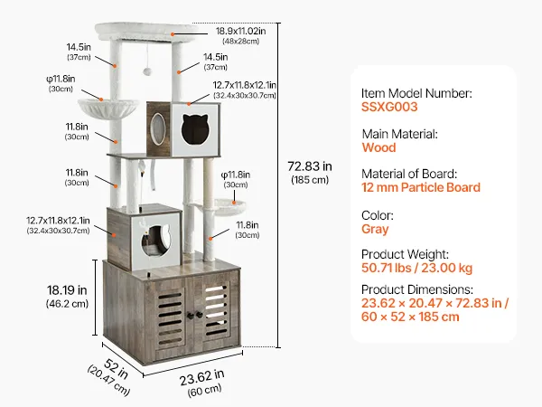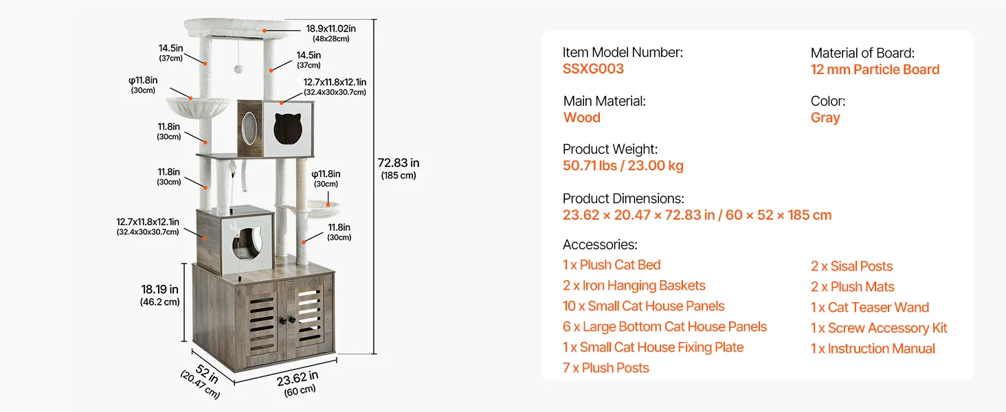 Multi-Functional Cat Condo: This 2-in-1 cat tree combines a litter box enclosure with a multi-level cat climbing tower, providing your cat with a private space and a fun play area. The litter box enclosure helps reduce unwanted smells and scattered litter, for clean and elegant home. Compatible with litter boxes sized 22.44 x 19.69 x 16.93 in. With a maximum platform gap of 23.62 in, this cat tree is not suitable for kittens. It is designed for medium to large cats with strong jumping ability.
