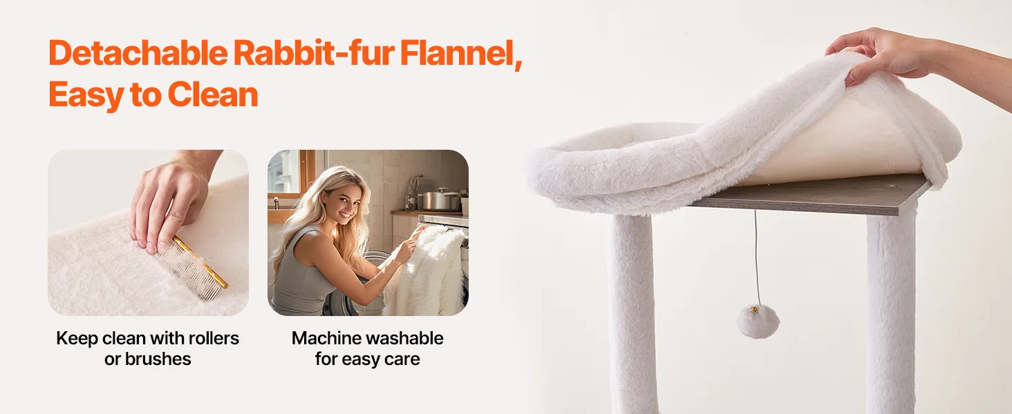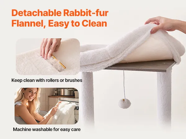 Easy-to-Clean Cushion: Give your cat the cloud-like comfort it deserves! This large cat tree features soft faux rabbit fur cushions on each level, enhancing grip while providing a cozy spot to rest. With detachable, washable pads, this cat tree is both comfortable for your cat and easy to maintain for you.
