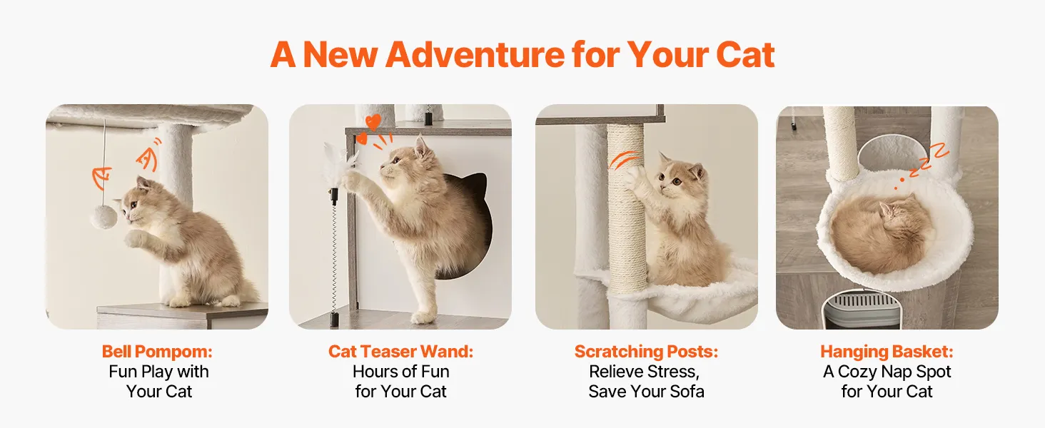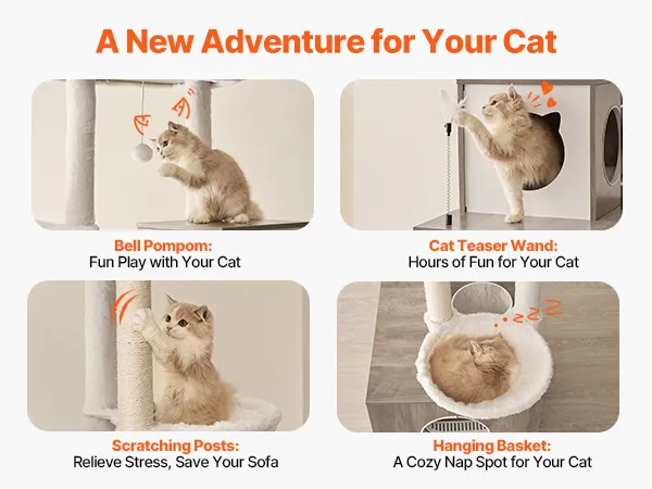 This cat tower includes fun toys like a dangling ball and a teaser stick to spark your cat's curiosity and playfulness. The natural sisal posts satisfy their scratching instincts, while the multi-level design provides endless opportunities for climbing, jumping, and lounging.