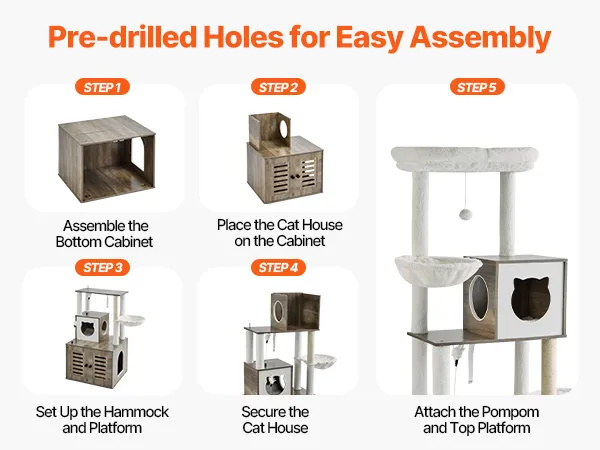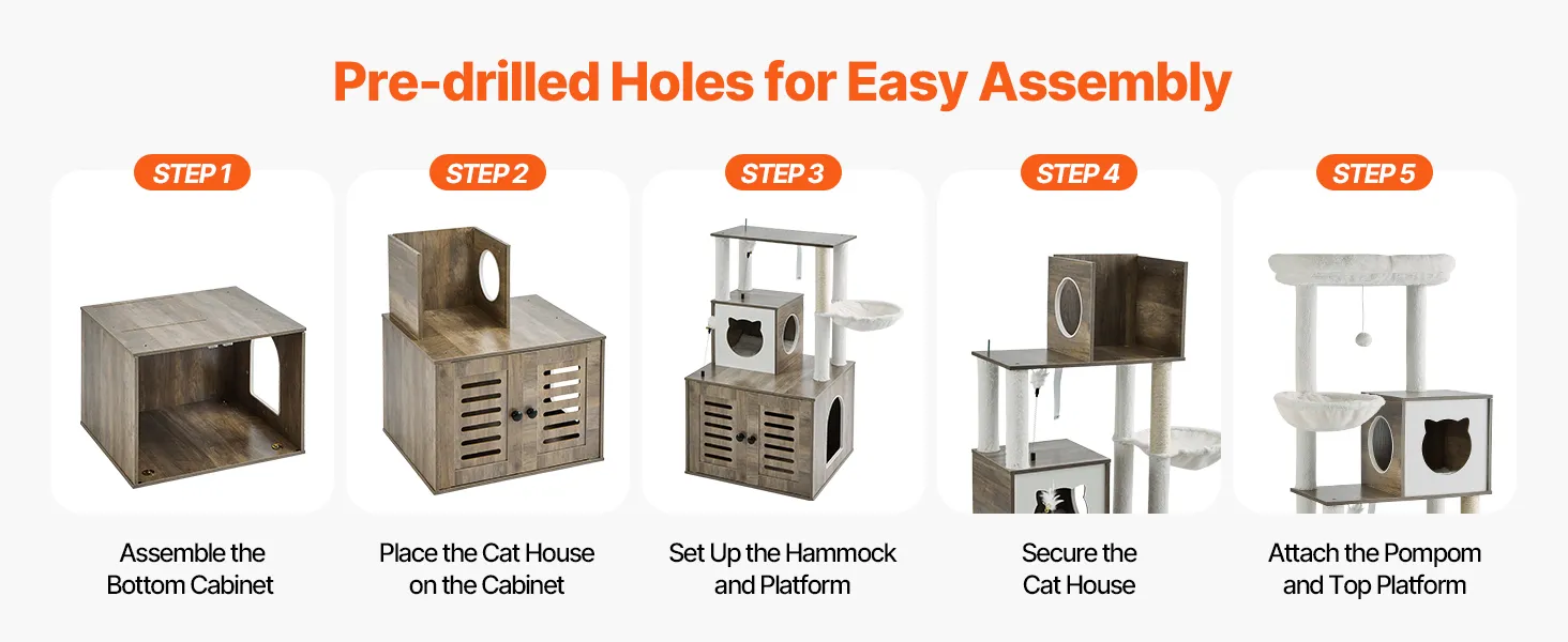 Quick Setup, Instant Fun: Setting up your cat tree has never been easier. With pre-drilled holes and all the tools included, you'll have your cat’s new playground ready in no time. Get your furry friend’s space set up quickly, and let them start exploring their new multi-level condo.