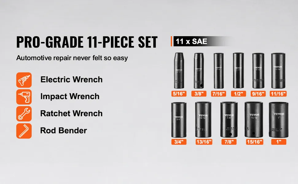 Con una configuración profesional de 11 piezas, este juego se puede utilizar con llaves eléctricas, llaves de impacto, llaves de trinquete, dobladoras de varillas y otras herramientas para mantenimiento automotriz, ensamblaje de equipos, fabricación industrial, inspecciones de energía y más.