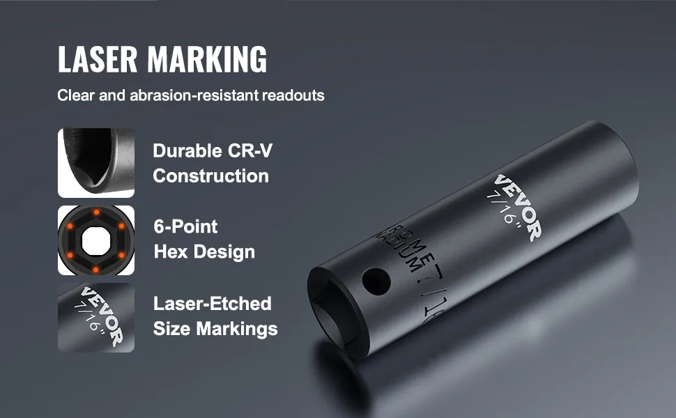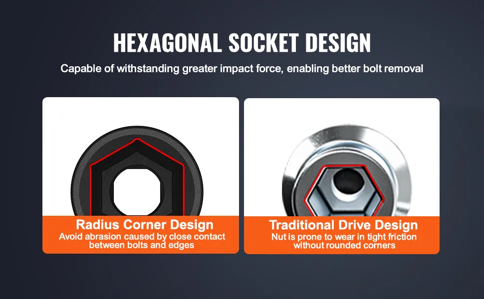 Alto par: este juego de herramientas de vaso, que se distingue por su diseño de accionamiento hexagonal, que lo distingue de los diseños tradicionales que carecen de esquinas redondeadas, reduce significativamente la presión ejercida sobre los sujetadores durante el impacto. Como resultado, minimiza el desgaste y evita de manera efectiva que los pernos se redondeen y se descascarillen.
