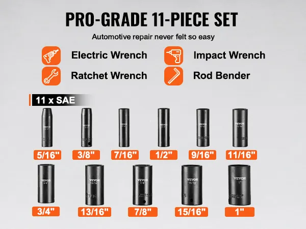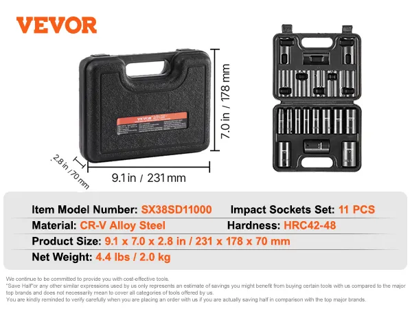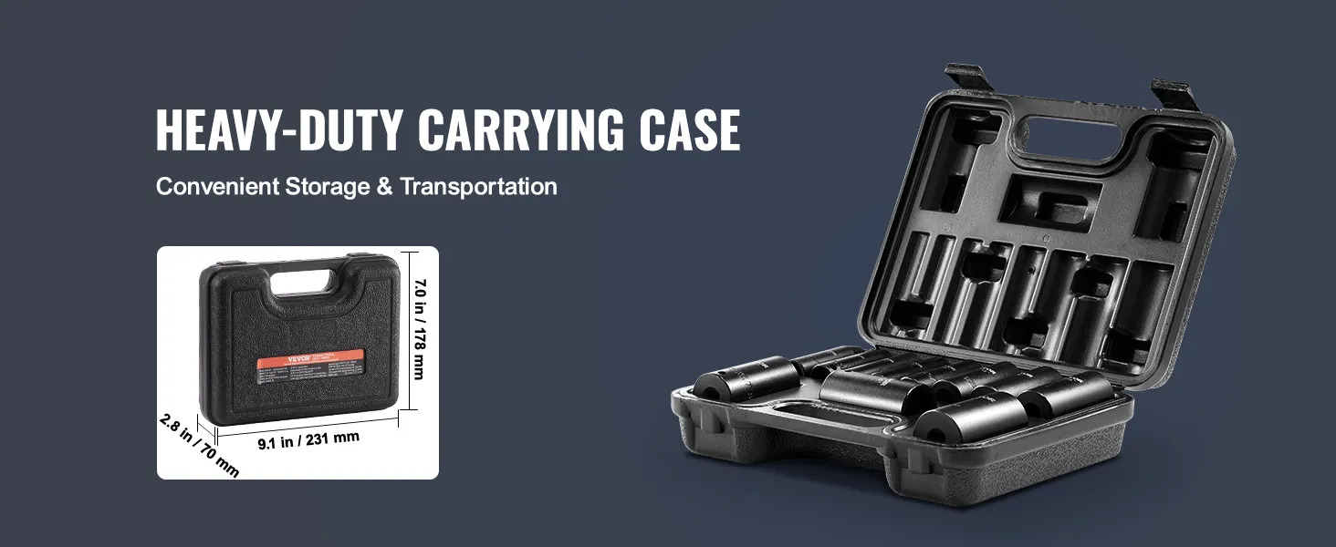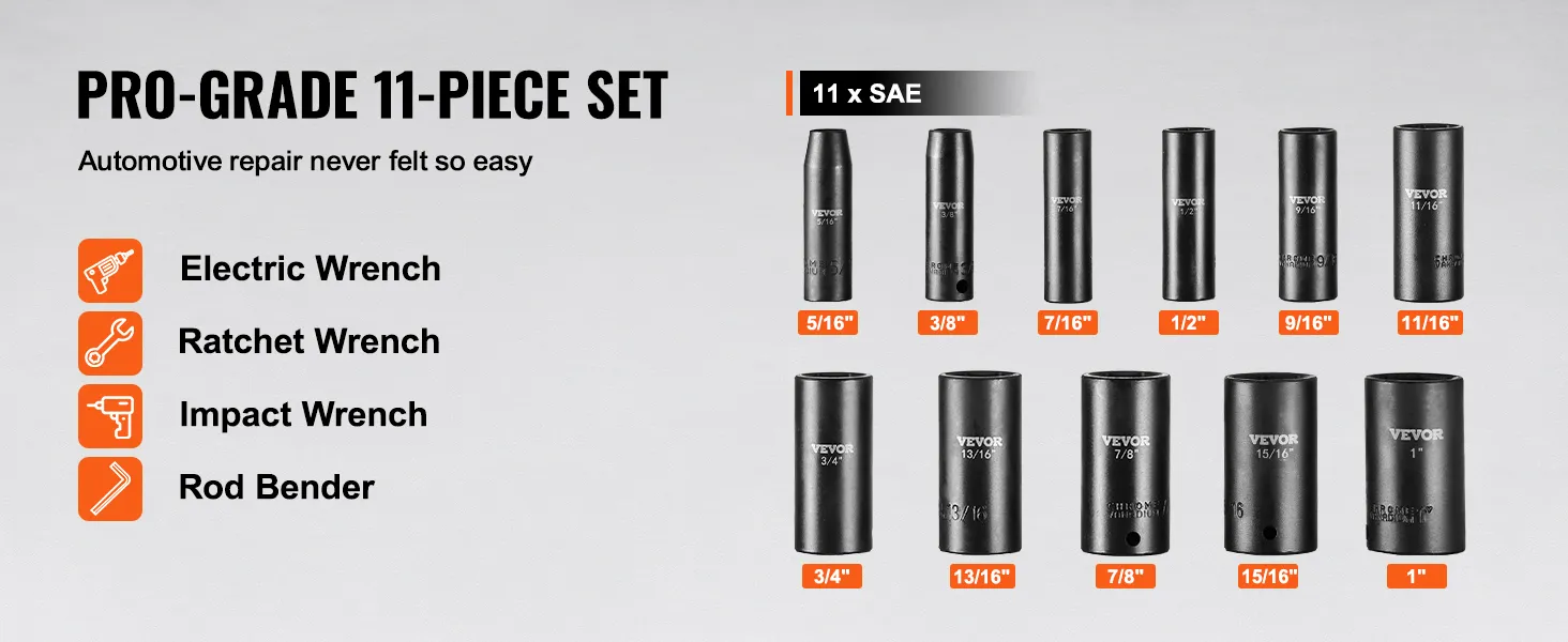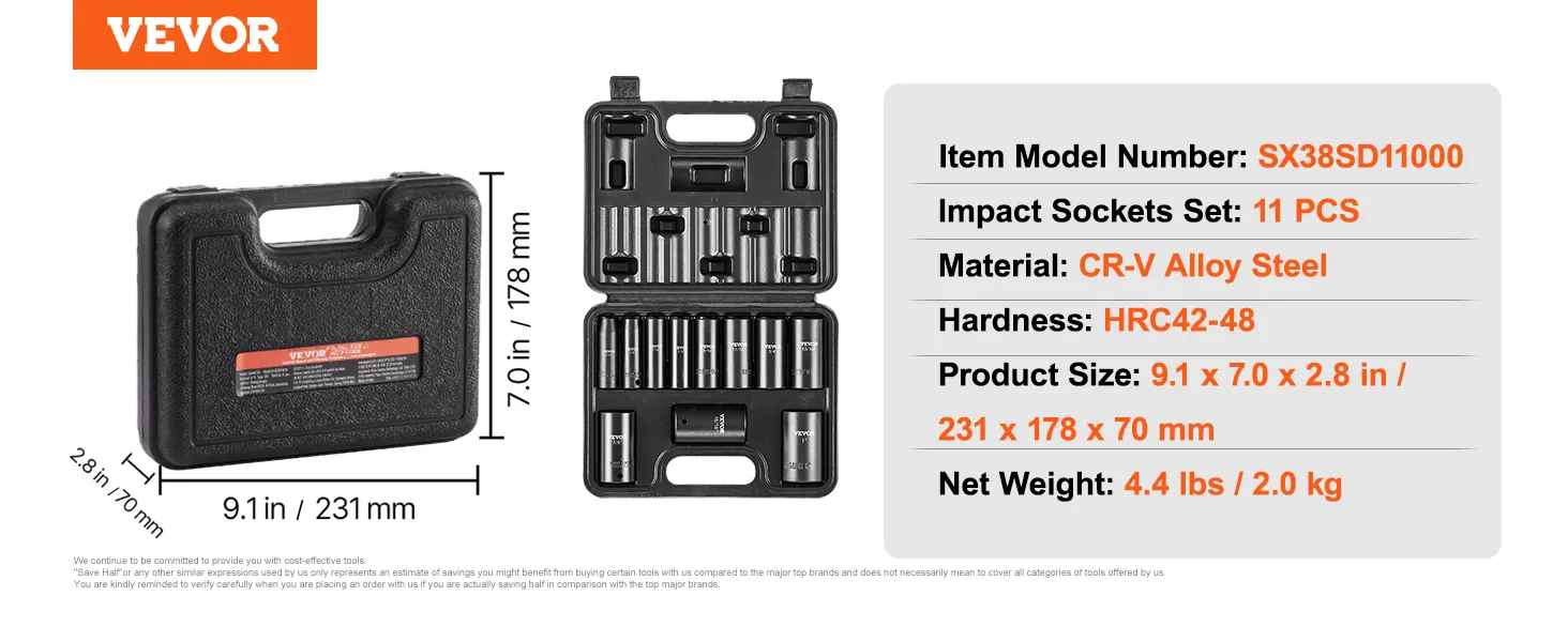 Are you looking for a professional and portable set of impact sockets? VEVOR's 11-piece impact socket set offers a complete range of tools, especially suitable for repairing different brands of automobiles.